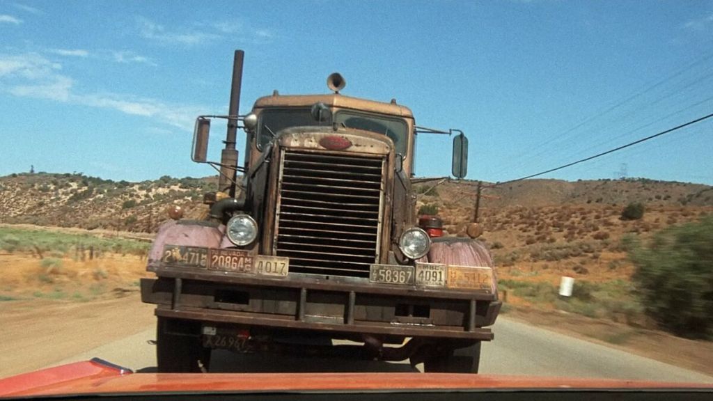 The concept of Duel is simple: a salesman named David Mann (that name isn’t a coincidence) starts driving his red Plymouth Valiant through the Mojave Desert on his way to a business meeting. Almost immediately, he’s pursued by a madman driving a monstrous Peterbilt 281 semi truck, which tries to run David off the road, into oncoming traffic, onto railroad tracks as a train approaches…basically any way that David and his nice red car end up smashed all over the asphalt. The film is entirely devoted to this cat-and-mouse pursuit, which is never explained and is all the more unsettling for its nonsensicality.