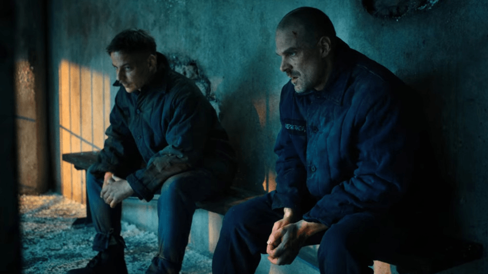 Meanwhile, Hopper’s (David Harbor) story also take a significant leap forward. Following his failed prison break, Hopper now finds himself in another facility alongside his Soviet accomplice, Enzo (Tom Wlaschiha), who has also been imprisoned. Like Bobby Brown, Harbor is also given his first chance to shine dramatically; to Enzo he delivers a monologue recapping the fraught events of his life. “I wasn’t cursed… I am the curse”, he laments. It is a potentially melodramatic line that Harbor delivers with impressive earnestness. When he’s finished, the tone shifts to subdued horror; the two men realize their deadly predicament. They look down into the courtyard where human blood and body parts had been mysteriously cleaned up earlier.