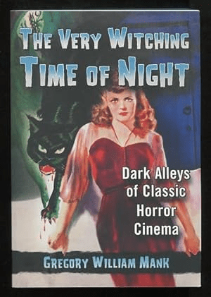 Gregory William Mank is a prolific Hollywood horror historian, writing numerous books on the subject. The Very Witching Time of Night: Dark Alleys of Classic Horror Cinema, published 2014, chronicles an variety of topics from the Golden Age of Hollywood horror (1930s-1940s). As Mank states in the introduction, the genesis of the book stemmed from his desire to tell “tangential material” to his other, more focused topics; material that “cried out for its own focus and attention.” Therefore, instead of a book solely dedicated to the Universal Frankenstein series, or women in horror films of the 1930s-1940s, The Very Witching Time of Night dedicates singular chapters to a vast array of Hollywood characters, stories, and film productions. Highlights include: